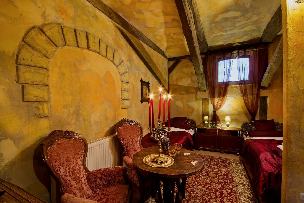 Przyciemniony pokój z nostalgiczną aurą. Urządzony w bordowych barwach tworzy lekko mroczną aurę. Idealny dla myślicieli i marzycieli.